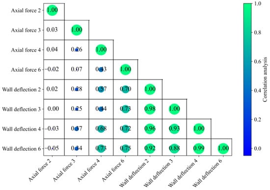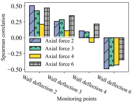 Based on these concerns, the non-linear correlation between servo axial forces and wall deflection is analyzed using the Spearman correlation coefficient, as shown in Figure 10. Notably, axial forces of 0 and the corresponding wall deflections are excluded. The results show that most axial forces and wall deflections exhibit weak to moderate correlations. This analysis demonstrates that servo axial forces have the potential to control wall deflections and also highlights the need for coordination among multiple supporting axial forces.