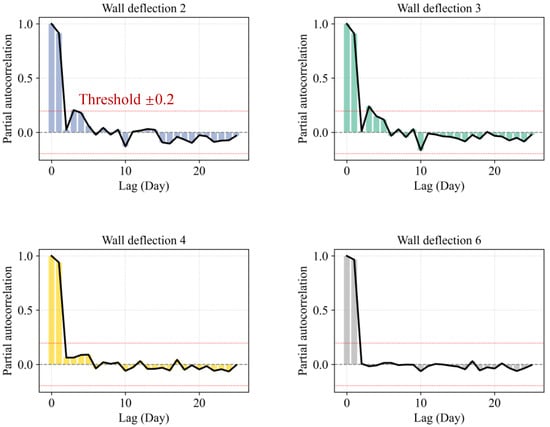 Selecting appropriate lag days is critical for deformation prediction, as it ensures the model effectively captures the key temporal patterns and historical dependencies within the deformation process. Figure 11 show the partial autocorrelation for wall deflections at different lags (days). Each graph represents different deflection measurements. The significance threshold, marked at 0.2, is calculated based on 95% confidence using the formula threshold = ±1.96× 1/, where N is the sample size. From the analysis, it is observed that Lag 1 consistently shows significant partial autocorrelations across all wall deflections, indicating that the value at any given point in the time series is closely related to the value at the previous point, and this relationship is not influenced by the effects of other points in between. Hence, Lag 1 is selected as a feature input. Meanwhile, for wall deflections 2 and 3, the partial autocorrelations at Lag 3 and Lag 4 exceed or approach the threshold of 0.2. Therefore, a time window of size 4 is used to capture the time correlations from Lag 1 to Lag 4.
