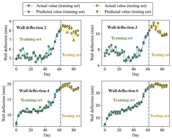 Figure 12 shows the prediction results of the ST-GAT neural network at four different depth monitoring points along the same inclinometer. The predicted values of the model show good consistency with the actual values in the training set, indicating that the proposed model effectively captures the deformation features from historical data. Similarly, the model demonstrates strong consistency in the testing set, highlighting its excellent generalization capability on unseen data. Table 2 and Table 3 evaluate the prediction results of the training and testing sets in terms of MSE, MAE, and R2. The results indicate that wall deflections 2 and 3 achieve lower MSE and MAE values, as well as higher R2 values, in both the training and testing sets, suggesting accurate predictions at these points. Specifically, wall deflection 3 exhibits the best generalization performance with the lowest MSE (0.126 mm2), MAE (0.263 mm), and a high R2 value of 0.917 in the testing set.