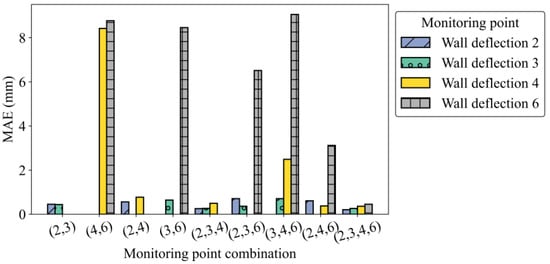 The effect of spatial relationships between adjacent monitoring points is demonstrated by comparing the performance of the ST-GAT neural network under different monitoring point combinations. The results evaluated using MAE are presented in Figure 13. The result shows a clear variance in MAE for different monitoring point combinations. For example, combinations like (4,6), (3,6), and (3,4,6) tend to have higher MAE values, especially for wall deflection point 6, which consistently shows the highest errors across several combinations. The largest MAE values are observed for wall deflection 6 across multiple combinations, indicating that predicting this monitoring point is more challenging. This may be due to its proximity to the maximum deflection point of the inclinometer and the fact that the support is installed last in this area, leading to the greatest impact. However, when multiple monitoring points are used together, such as in the combination (2,3,4,6), the prediction error for deflection 6 improves significantly. This demonstrated that utilizing the spatial relationships between multiple monitoring points can lead to better performance for all deflection points.