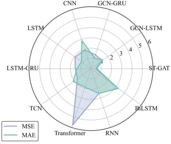 Figure 14 compares these models using MSE and MAE with ST-GAT delivering the best performance on both metrics (MSE: 0.485 mm2, MAE: 0.567 mm). The GCN-GRU and GCN-LSTM models also show relatively low errors (MSE: 1.331 mm2 and 1.418 mm2), highlighting their effectiveness in capturing spatial–temporal relationships. However, CNN performs poorly, with significantly higher MSE (1.913 mm2) and MAE (2.88 mm), which is likely due to its limitations in handling sequential data. Other models, such as BiLSTM and RNN, produce the highest errors, with BiLSTM reaching an MSE of 3.283 mm2 and an MAE of 3.240 mm. This suggests that while they handle temporal sequences well, they may struggle with complex spatial dependencies in this application. Similarly, Transformer, though effective in many sequence tasks, underperforms here with an MSE of 5.768 mm2, showing difficulties in predicting continuous deflections. Overall, GAT-GRU proves to be the best-performing model, outperforming alternatives by efficiently utilizing both spatial and temporal data. The incorporation of attention mechanisms through GAT and temporal processing via GRU gives it a distinct advantage in reducing prediction errors in predicting time-series deflections at multiple monitoring locations.