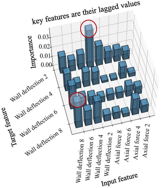 Figure 16 represents a feature attribution map between various input features. The importance of input features is evaluated using integrated gradients. This method attributes feature importance by calculating the cumulative change in the model output as each feature transitions from a baseline to its actual value, offering a more reliable explanation of the deflection predictions. On the x-axis, features such as “Wall deflection” and “Axial force” are plotted, while the height of each bar shows the importance of each feature to the target feature. For “Wall deflection 2” and “Wall deflection 8,” as highlighted by the red circles, the most important features are their own lagged values from the previous step. For the other points, neighboring monitoring points play a more significant role. This demonstrates that wall deflection at a given location is influenced by multiple surrounding monitoring points, highlighting the need to consider spatial relationships between monitoring points for accurate prediction. Axial forces affect different wall deflections to varying degrees, but their overall impact is substantial. This suggests the potential for developing a model that controls wall deflection by adjusting axial forces.