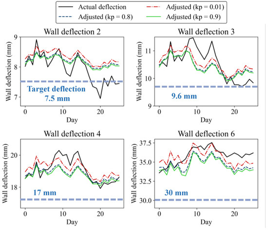 - The proposed ST-GAT-based PID controller can adjust wall deflection to a target value. Specifically, a larger kp value results in a faster response, meaning the deflection approaches the target more rapidly as kp increases. When adjusting kp alone cannot bring the deflection to the desired target, the integral component is added. With appropriate kp and ki settings, the proposed control model can achieve the proactive control of wall deflection.