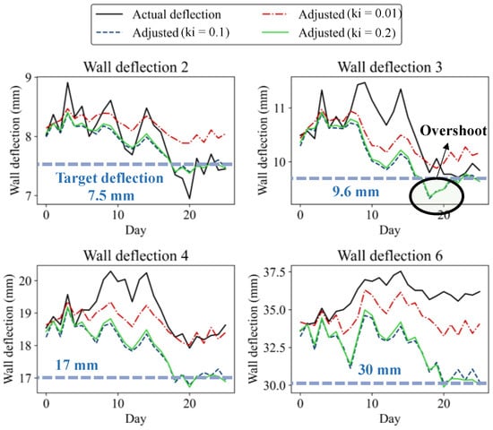 Based on the previous analysis of the prediction results and the visualization of the connections between different features and nodes, the effectiveness of the proposed wall deflection prediction model has been validated. The prediction results, combined with a servo support system, are input to a PID controller, developing an intelligent control system for wall deflection. Specifically, P refers to the proportional component, which adjusts the control output proportionally to the current error. I represents the integral component, which accounts for past errors to eliminate steady-state offset; and D is the differentiation component, which predicts future error trends by considering the rate of change, facilitating the stabilization of the system and reducing overshooting. For most tasks, using the P and I components is sufficient to meet control requirements [,]. Therefore, this study considers wall deflection under different kp and ki settings. kp refers to the proportional gain, while ki is the integral gain. Figure 17 shows wall deflection control when kp is set as 0.01, 0.8, and 0.9. In these cases, ki is set as 0. The blue dashed line represents the target deflection values, which are set as 7.5 mm, 9.6 mm, 17 mm, and 30 mm for monitoring points 2, 3, 4, and 6, respectively. The results indicate that as the kp value increases, the control model responds more rapidly. Specifically, the adjusted wall deflection converges toward the target deflection faster with higher kp values. This trend is evident from the graphs, where closer alignment with the target deflection lines (blue dashed) is observed as kp increases from 0.01 to 0.9. However, small errors still remain in the adjusted wall deflection at points 2 and 3, while larger errors persist at points 4 and 6. This discrepancy suggests that the integral component should be further incorporated into the control model. The effects of adjusting the ki settings on wall deflection are presented in Figure 18. The error at ki = 0.01 is significantly larger than those at ki = 0.1 and 0.2. Both ki = 0.1 and 0.2 reach the target deflection values after about 18 days of adjustment with ki = 0.2 showing better results at deflection points 4 and 6. Although a slight overshoot occurs at wall deflection point 3, with the deflection exceeding the target by less than 0.3 mm, it quickly stabilizes within one to two days. The results indicate that by properly setting ki and kp, the proposed intelligent control system can effectively control wall deflection, keeping it close to the target deflection.