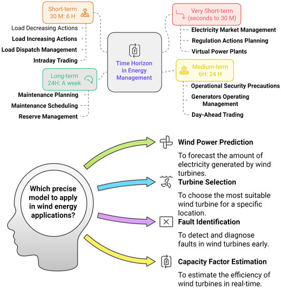 As shown in Figure 2, wind speed and wind power predictions are further grouped according to their time horizons [35,36]. Weekly forecasts assist in planning maintenance operations at wind farms. Daily forecasts benefit electricity market participants, and intra-day predictions are crucial for short-term markets and maintaining a real-time balance between supply and demand [37,38].
