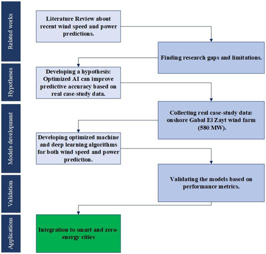 The core aim of this paper is to develop a robust system for wind speed forecasting (WSF) and wind power forecasting (WPF) using pattern recognition models across various time scales. To achieve the study’s aim, this study applied a quantitative approach as illustrated in Figure 3. This research process outlines a systematic approach for enhancing wind speed and power prediction through AI. The research process begins with a literature review to understand current methodologies and identify gaps. A hypothesis is formed that optimized AI could enhance prediction accuracy using real-world data from the Gabal El Zayt wind farm. These AI models are validated using performance metrics. Finally, the validated models are integrated into the planning and operation of smart, zero-energy cities, showcasing their practical application in sustainable urban development.