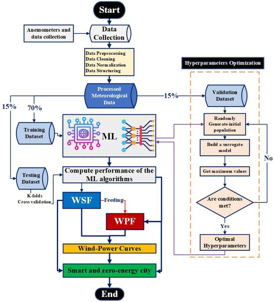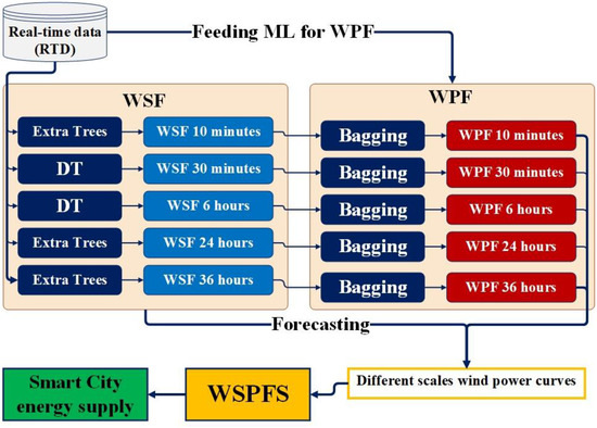 The primary objective of this paper is to present a novel integrated wind speed–power forecasting system (WSPFS) designed to enhance renewable energy forecasting for smart and zero-energy cities. Unlike previous studies, which often focus on isolated aspects of either wind speed or power prediction as illustrated in Table 1, this study introduces a multi-horizon forecasting approach that seamlessly integrates wind speed forecasting (WSF) outputs as inputs for wind power forecasting (WPF). This comprehensive system evaluates the performance of 12 AI algorithms, including individual and ensemble models, across diverse forecasting horizons ranging from 10 min to 36 h. The system also incorporates metrics to benchmark predictive accuracy, addressing short- and long-term forecasting needs.