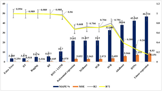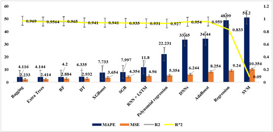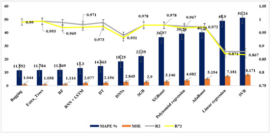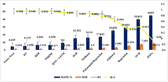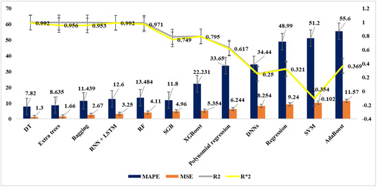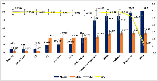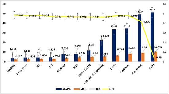 For longer forecasting intervals, such as the 6 h, 24 h, and 36 h scales (Figure 13, Figure 14 and Figure 15), the trends remained consistent, with Bagging, Extra Trees, RF, DT, XGBoost, and SGB models consistently achieving high performance. At the 6 h scale, the top models achieved MAPE values near 4%, showcasing their capability to handle extended prediction horizons while maintaining accuracy. At the 24 h scale, Bagging and Extra Trees emerged as the most reliable models, followed by RF, DT, XGBoost, and SGB, indicating their adaptability to medium-term predictions. The same ensemble-based methods retained their edge at the 36 h scale, solidifying their position as reliable tools for long-term wind speed and power forecasting. In contrast, models such as DNNs, AdaBoost, regression, and SVM consistently underperformed across all intervals. These results underscore the importance of leveraging ensemble methods and decision-tree-based models for comprehensive wind forecasting, as they effectively balance accuracy, computational efficiency, and scalability over varying time horizons.