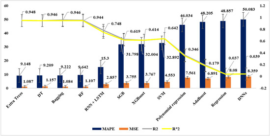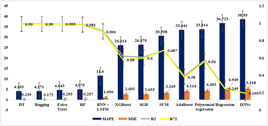 For 24 h ahead WSF (Figure 9), DT, Bagging, Extra Trees, and RF again led the rankings, achieving MAPE values of 4.645%, 5.179%, 6.502%, and 6.538%. While models like XGBoost and polynomial regression performed satisfactorily, DNN and SVM models showed poor accuracy. Finally, at the 36 h scale (Figure 10), Extra Trees, DT, Bagging, and RF continued their strong performance, with MAPE values around 9%, reinforcing their reliability across time scales. Overall, tree-based and ensemble models, particularly Extra Trees and DT, consistently outperformed others for WSF, while DNNs underperformed across all time scales.