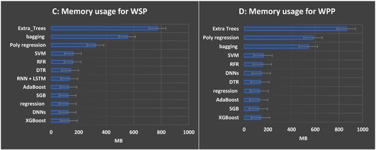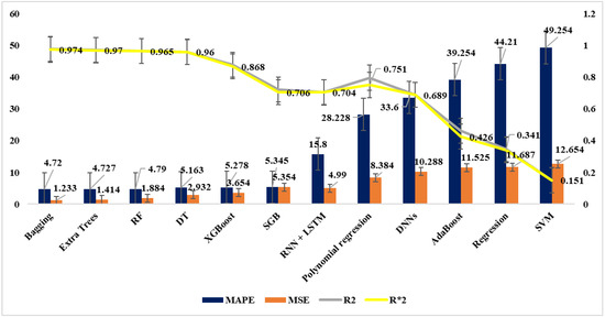 At the 30 min forecasting interval (Figure 12), Bagging and Extra Trees models demonstrated exceptional accuracy, achieving MAPE values of 4.12% and 4.15%, respectively. This performance highlights their robustness and ability to effectively handle short-term fluctuations in wind speed. RF and DT followed closely, achieving MAPE values of 4.183% and 9.664%, respectively, confirming their utility for short-term predictions. XGBoost and SGB also delivered reasonably good results, reinforcing their versatility for various forecasting tasks, although they fell short of the top performers. On the other hand, DNNs, AdaBoost, regression, and SVM struggled to produce reliable forecasts, potentially due to their higher sensitivity to parameter tuning and overfitting on smaller datasets. These findings emphasize that ensemble methods such as Bagging and Extra Trees excel in capturing the inherent complexities of wind speed variability over shorter periods, offering both precision and stability.