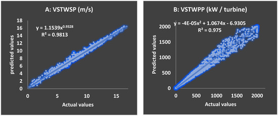 (A) Actual wind speed (m/s) observations against VSTWSF (m/s) and (B) actual power (kW/turbine) observations against VSTWPF (kW/turbine).