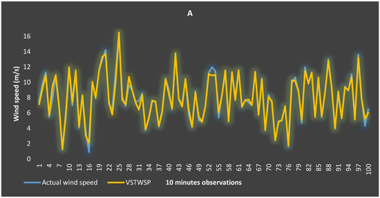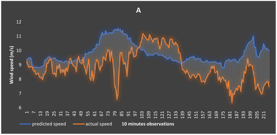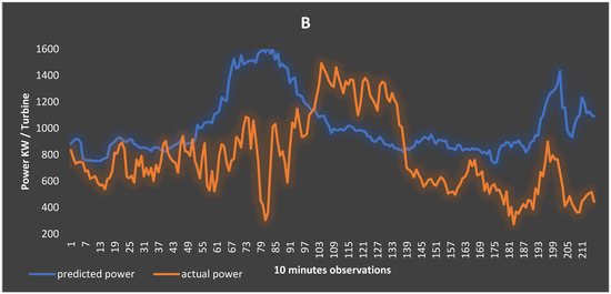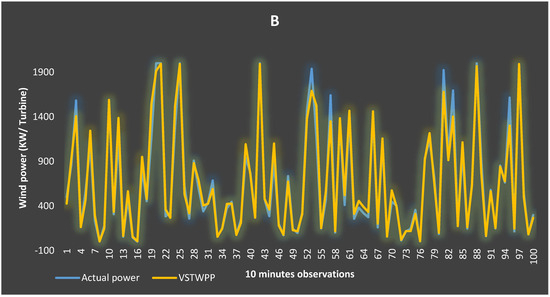 For further elaboration, Figure 16A and Figure 17A demonstrate the performance of the Extra Trees model for VSTWSF in meters per second (m/s). These figures show that the predicted VSTWSF values closely match the actual observed wind speeds, indicating a high level of accuracy in the model’s predictions. Similarly, Figure 16B and Figure 17B highlight the effectiveness of the Bagging model for predicting VSTWPF in kilowatts per turbine (kW/turbine).