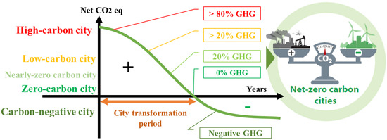 - Duan, Z.; Kim, S. Progress in Research on Net-Zero-Carbon Cities: A Literature Review and Knowledge Framework. Energies 2023, 16, 6279. [Google Scholar] [CrossRef]