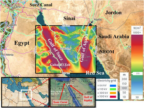 The onshore Gabal El-Zeit wind farm (580 MW) was chosen due to its significance and capacity, providing a comprehensive dataset for the models under development [62]. The strategic placement of renewable wind energy stations in proximity to the Suez Canal, Egypt, Jordan, and NEOM offers several significant advantages as shown in Figure 5. European investments and Saudi Arabian in the Gabal El-Zeit wind farm underscore a strategic partnership aimed at bolstering renewable energy capacities and environmental sustainability. Saudi Arabia’s interest, particularly in alignment with its Vision 2030 for energy diversification, complements European expertise and commitment to reducing carbon footprints, as demonstrated through various green initiatives and funding mechanisms [63,64]. The critical strengths at Gabal El-Zeit and the Gulf of Suez are as follows: