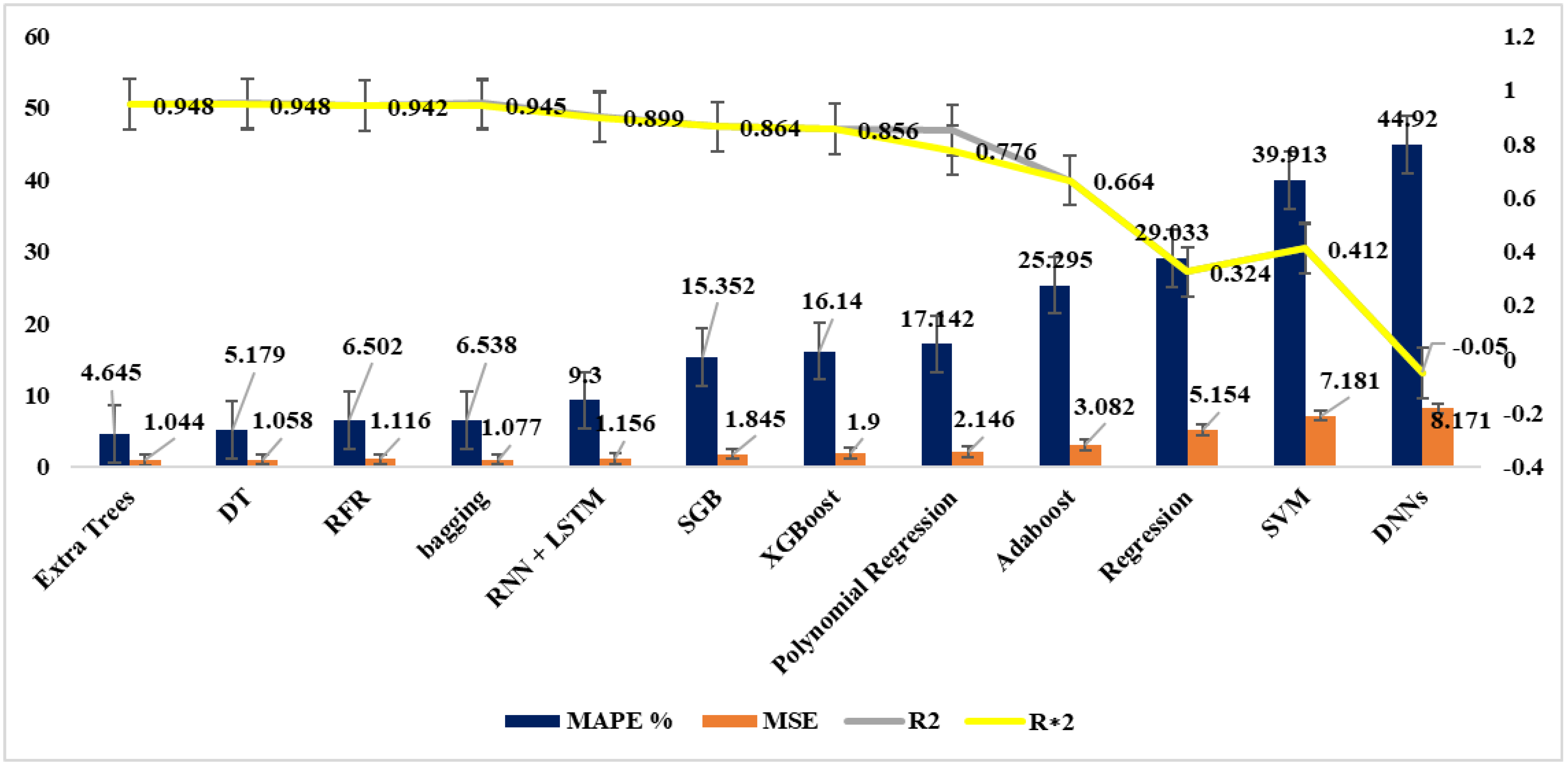 The two-sample t-test between the ensemble and single models resulted in a t-statistic of −1.14 and a p-value of 0.28. Since the p-value is greater than 0.05, the observed differences in accuracy (MAPE) between the ensemble and single methods are not statistically significant at the 5% level. This suggests that the superior performance of ensemble methods over single models in terms of MAPE, based on this data, is not statistically confirmed. Therefore, the paper included a confidence interval to all the result figures and selected the most accurate models based on performance metrics, where ensemble models outperformed the single machine learning algorithms. The computational cost comparison of ML models section discussed the computational cost of the developed models.