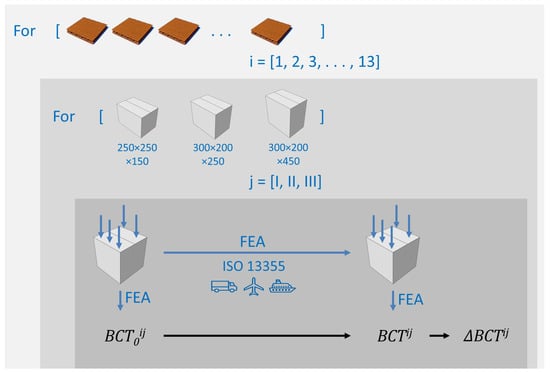 This study analysed the impact of the selected corrugated cardboard material on the decrease in the compressive load bearing capacity of packaging after a cycle of standard transportation loads. Thirteen types of corrugated cardboard materials and three packaging designs were considered, as shown in Figure 1. A variety of corrugated cardboards with different material parameters were selected (the first “For” loop for the (i) index in Figure 1). Section 2.2 discusses the material testing of the cardboards in detail, including sample preparation, test procedures, and the results obtained.