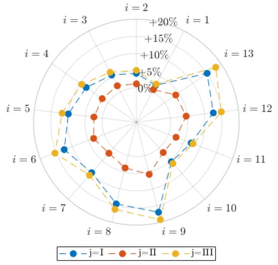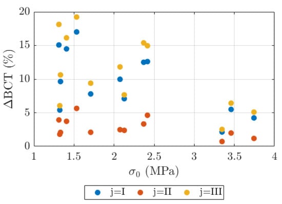 Percentage reduction (%) in the box compression test index () versus (−), for various materials (thirteen dots) and dimensions (j = I, II, III).