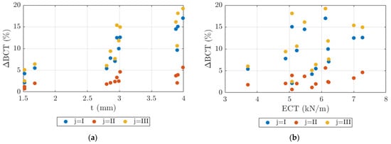 Percentage reduction (%) in the box compression test index () versus (a) (−) and versus (b) (MPa), for various materials (thirteen dots) and dimensions (j = I, II, III).