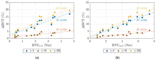 Percentage reduction (%) in the box compression test index () versus (a) (Nm) and versus (b) (Nm), for various materials (thirteen dots) and dimensions (j = I, II, III).