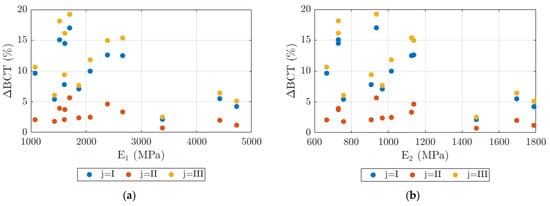 Percentage reduction (%) in the box compression test index () versus (a) (MPa) and versus (b) (MPa), for various materials (thirteen dots) and dimensions (j = I, II, III).