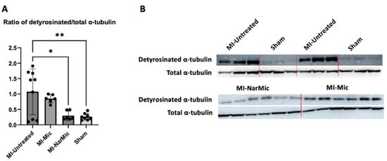 To assess the mechanisms underlying cardiomyocyte function between groups, we assessed the ratios of detyrosinated to total α-tubulin in the free microtubule fraction of rat left ventricular tissue (Figure 1). As expected, MI-Untreated rats had a significantly increased ratio of detyrosinated to total α-tubulin relative to Sham rats (p = 0.004). The MI-NarMic rats also had a significantly decreased ratio of detyrosinated to total α-tubulin relative to the MI-Untreated rats (p = 0.01) and a comparable ratio to that of the Sham rats (p = 0.99).