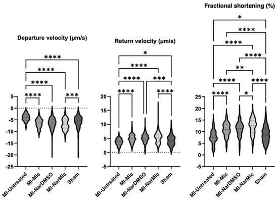 To assess the mechanisms underlying micellized naringenin’s hemodynamic effects at the cellular level, we assessed single cardiomyocyte contractility. A minimum of 120 myocytes from each cohort were assayed (Figure 2). The mean contraction velocity of cells from MI-Untreated rats was 4.03 µm/s, while that of cells from Sham rats was 5.83 µm/s (p < 0.0001). The MI-NarMic cells had the fastest contraction velocity of all cohorts at 6.96 µm/s, significantly faster than that of MI-Untreated rats (p < 0.0001) but not significantly faster than that of the MI-NarDMSO or MI-Mic rats (p > 0.05). Relaxation velocity and fractional shortening followed a similar relationship between groups. Relative to MI-Untreated cells, Sham cells had a faster relaxation velocity (4.33 vs. 3.67 µm/s, p = 0.03) and greater fractional shortening (8.9% vs. 7.7%, p = 0.02). Yet the MI-NarMic group had the fastest overall relaxation velocity (5.38 µm/s) and fractional shortening (12.2%) of all groups. The MI-NarMic cells had faster relaxation velocity than that of MI-Untreated cells (p < 0.0001), but comparable velocities to that of MI-NarDMSO and MI-NarMic cells (p > 0.05). With respect to fractional shortening, MI-NarMic cells had a greater fractional shortening than MI-Untreated cells (p < 0.0001), MI-Mic (p = 0.003), and MI-NarDMSO (p = 0.02) cells.