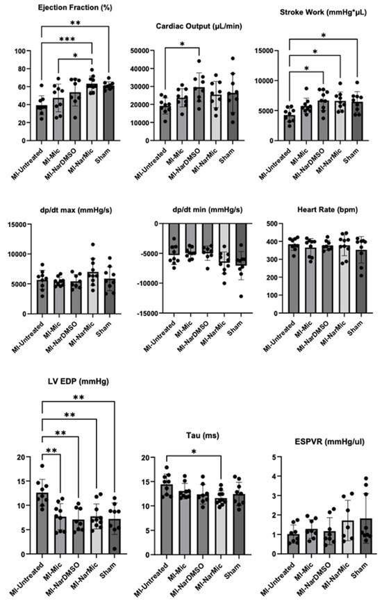 The hemodynamic outcomes of each group are displayed in Figure 3. The mean weight among all rats was 354 g and did not differ between groups (p = 0.84). The mean EF in the Sham cohort was 61.2%, while that in the MI-Untreated rats was 39.3% (p = 0.0018). The mean EF in the MI-NarMic cohort was 63.3%, which was comparable to that of the Sham (p = 0.99) and Nar-DMSO cohorts (p = 0.41) but greater than that of the MI-Mic (p = 0.03) and MI-Untreated (p = 0.0004) cohorts. The Sham, MI-NarMic, and MI-NarDMSO cohorts generated greater stroke work than the MI-Untreated rats (all p < 0.03) but did not differ with respect to one another (all p > 0.05). The Sham, MI-NarMic, MI-NarDMSO, and MI-Mic cohorts had lower left ventricular end-diastolic pressures than the MI-Untreated rats (all p < 0.004), suggesting superior diastolic function, but these cohorts did not differ with respect to one another (all p > 0.05). The MI-NarMic cohort had a faster tau than the MI-Untreated rats (p = 0.03) also suggesting improved diastolic function (all p > 0.05). The MI-NarDMSO cohort had a higher cardiac output than the MI-Untreated rats (p = 0.04) but did not differ significantly from the other cohorts. No cohorts differed with respect to the end-systolic pressure–volume relationship (p > 0.05).
