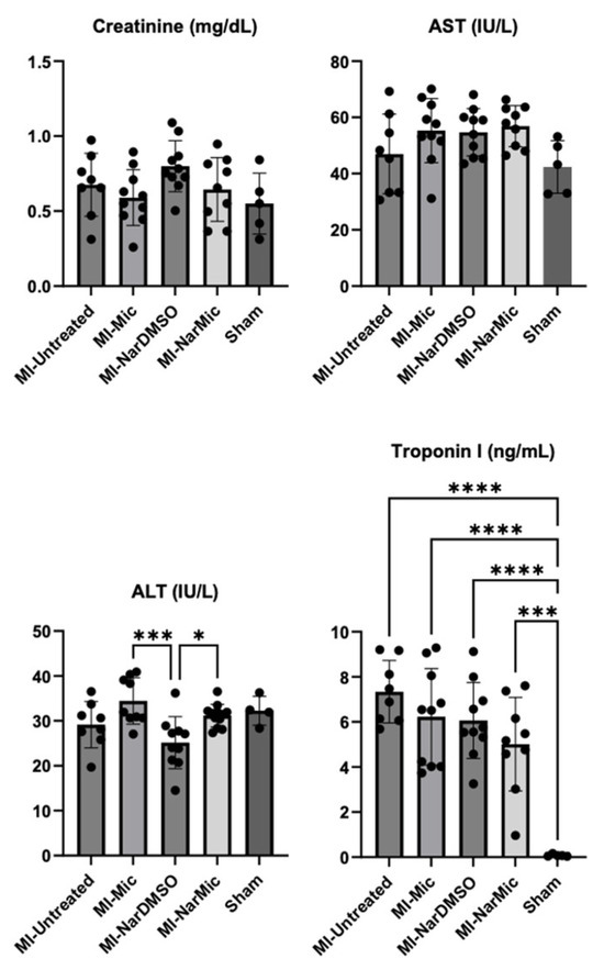 To assess naringenin’s toxicity when administered intramyocardially, rat serum was assessed for levels of creatinine, aspartate transaminase (AST), alanine transaminase (ALT), and troponin I one day after MI (Figure 4). There were no differences between groups with respect to serum creatinine, a measure of kidney function, or AST, a measure of liver function (all p > 0.05). There was a statistically lower ALT in the MI-NarDMSO group (25.2 IU/L) than in the MI-Mic (34.4 IU/L) and MI-NarMic (31.2 IU/L) groups, but no group had ALT levels that would be considered greater than the normal range in Wistar rats [16]. As expected, all groups who underwent MI had a significantly higher troponin I than the Sham group (all p < 0.001). The groups who underwent MI all had similar troponin I levels (all p > 0.05), suggesting comparable amounts of myocyte death in each group.
