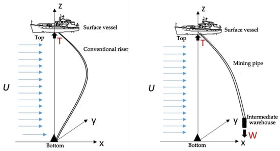 Model sketch (left: traditional riser; right: deep-sea mining pipe).