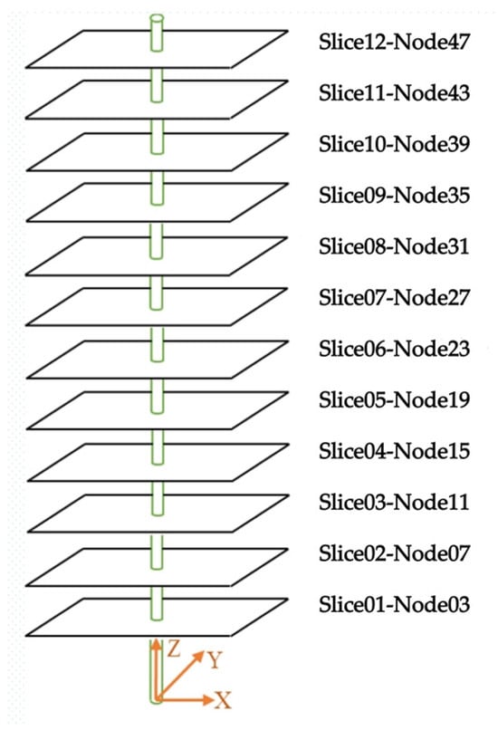 The research of Willden and Graham [] indicates that the slicing method can convert the intricate three-dimensional flow issue into multiple fundamental two-dimensional flow problems. In structural dynamics, the storage and computational demands are relatively minimal, whereas CFD requires extensive computational resources. Consequently, the number of slice points is generally fewer than the number of nodes on the riser. By enhancing the granularity of the finite element node distribution, the precision in simulating the riser’s structural motion is improved. Simultaneously, reducing the number of CFD slices contributes to computational efficiency. Typically, the count of these slices is an integer multiple of the structural units. For the purposes of this study, twelve two-dimensional flow-field slices are strategically positioned along the riser to ensure coverage of at least three times the highest mode number depicted in Figure 2. The orientation is defined by the flow direction aligned positively along the x-axis and the axial direction of the riser extending from the bottom upward along the z-axis, sequentially setting the twelve slices along the tube’s length.