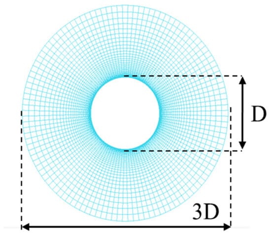 Firstly, the size of the selected computing domain is 30D × 60D, and the region is properly encrypted during grid division. Finally, the final two-dimensional flow-field grid is created through grid-nesting technology. In addition, during the meshing process, we need to pay special attention to the mesh size of the outermost mesh of the foreground grid, as it should be slightly larger than the mesh size of the encrypted area of the background grid, so as to ensure that the overlap of the foreground grid can find interpolation points on the background grid at any time. The entire computing domain is divided into two main computing domains, namely the foreground computing domain (Figure 3) and the background computing domain (Figure 4).