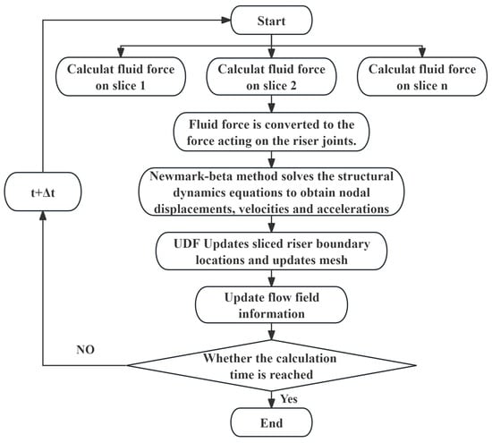 In this study, we use the Fluent separation method to calculate the viscous flow field and set the initial conditions. Then, the fluid force on the surface of the tube is obtained by numerical calculation, and it is applied to the motion equation of the tube structure and solved numerically to calculate the instantaneous motion velocity and instantaneous motion displacement of the cylinder in the current time step. In this way, the movement of the tube and the deformation of the mesh are controlled. By using the UDF program compiled in the C language environment in Fluent, we can calculate the coupling between the viscous flow field and the pipe structure. The numerical solution process of the slice method is shown in Figure 5.