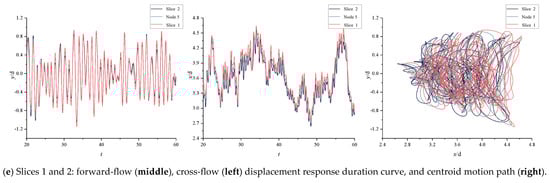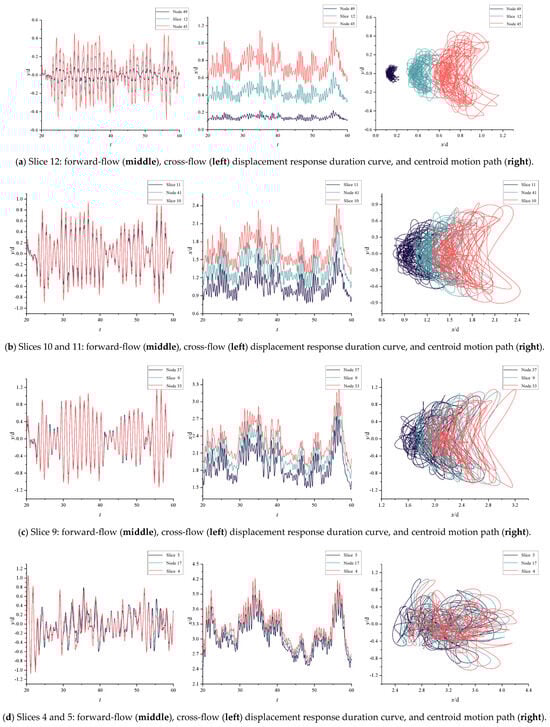 It can be found that the movement of the upper end of the mining pipe is relatively chaotic, and its shape is like a “cashew nut”; this is due to the locking of the downstream vibrations occurring, which affects the cross-flow vibration frequency and leads to chaotic vibration trajectories. From slice 12 to slice 10, the outline of the motion track starts to become confused gradually when slice 9 begins, but when it is near the bottom, it can be observed that the moving track of the mining pipe has an obvious “8” shape stage, which is caused by the binding force generated by the bottom of the mining pipe under the effect of the middle bin at the bottom, resulting in a change in the phase of the cross-flow and down-flow displacements, also making the bottom movement mixed with stability in the chaos. The randomness and complexity of mining-pipe movement are more obvious.