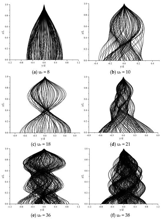 Figure 8 illustrates the envelope of the instantaneous dimensionless displacement in the cross-flow direction of a deep-sea mining pipe at different reduced velocity values: ur = 8, 18, 36, 10, 21, and 38.