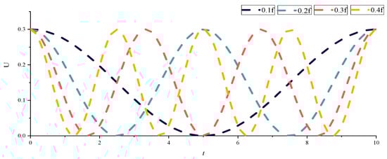 Four oscillating flow frequencies, f = 0.1f1, f = 0.2f1, f = 0.3f1, and f = 0.4f1, were selected for the oscillating flow conditions selected in the numerical simulation in this section, as shown in Figure 9 for details.