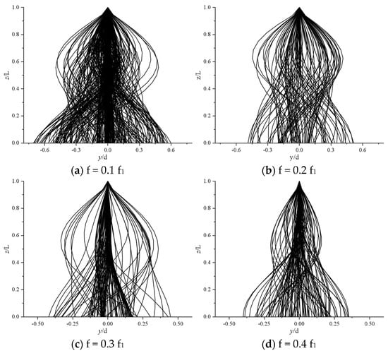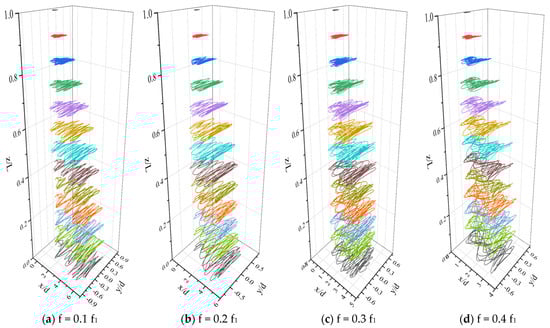 The change in vibration displacement at different positions of the deep-sea mining pipe with the oscillation frequency is analyzed by observing Figure 10. It is found that the moving distance of the mining pipe increases continuously along the current, which accords with the feature of free bottom end of the mining pipe. Initially moving in the negative direction of the x-axis, the riser soon reverses its course to the positive x-axis due to the phenomenon known as “Hysteresis”. The maximum vibrational displacement of the riser in the cross-flow direction exhibits a unique pattern: it in-creases from the top downwards, diminishes, and then rises again around 0.3 z/L. This pattern is likely induced by the second-order vibration mode of the mining pipe in the cross-flow direction. It is found that the instantaneous amplitude in the downstream direction is much larger than the instantaneous amplitude in the transverse direction, and the vibration track of the mining pipe has no fixed shape when the transverse direction displacement increases gradually. With the increase in down-flow displacement, the instantaneous amplitude of mining pipe in the down-flow direction gradually decreases and gradually changes into down-flow instantaneous amplitude less than cross-flow instantaneous amplitude. When the forward displacement reaches the maximum value, the mining pipe appears to have an “8” shape vibration track, which is similar to that when the oscillating flow acts on the traditional riser, because the two have the same physical appearance and belong to the category of cylindrical flow.