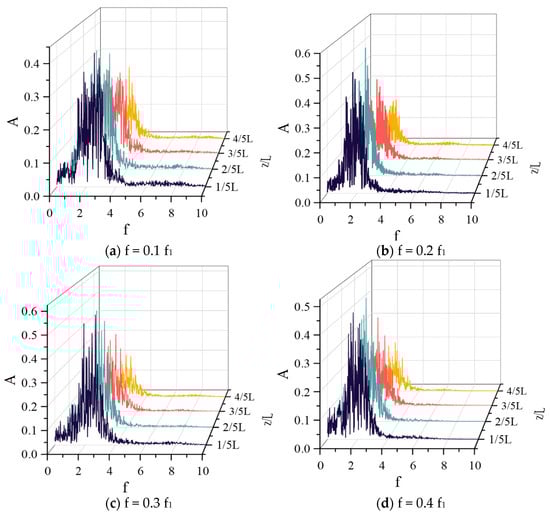 Figure 12 vividly illustrates that regardless of the variations in oscillation frequencies applied, the frequency characteristics of the cross-flow vibrations of the deep-sea mining pipe remain consistent. This observation underscores that the alterations in the frequency of superimposed oscillatory flows do not significantly impact the inherent vibration frequencies of the mining pipe. Notably, across five specified axial positions along the pipe, the amplitude frequencies are remarkably uniform, lying within a band from 0.5 Hz to 4.0 Hz, where the predominant frequency consistently hovers around 2.7 Hz. The stability of this frequency band can be attributed to the adjustments in the vibration frequency within the cross-flow direction, which correlate directly with changes in the velocity of the oscillating flow. Furthermore, an examination of the amplitude reveals that the axial vibration amplitude of the mining pipe demonstrates a gradual enhancement from the top towards the bottom, illustrating a clear gradient in vibrational intensity along the pipe’s length.
