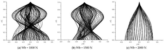 The instantaneous dimensionless displacement envelopes for u = 0.2 m/s, Wb = 1000 N, Wb = 1500 N, and Wb = 2000 N in the transverse flow direction of the deep-sea mining tube are given in Figure 13, respectively.