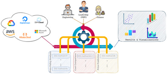 The system is designed to handle data from various sources, analyze them using established and customizable methods, and provide visualized insights. Figure 2 illustrates the architecture of the CloudPricingOps framework, demonstrating its capability to support different modules, decision-making methods and tools, and also extensions for diverse user requirements.