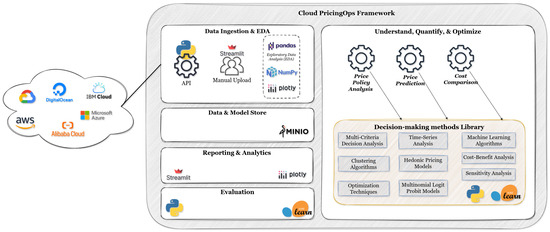 The CloudPricingOps framework’s architecture was made to be modular and flexible, so it can easily accept different decision support system (DSS) methods for studying and improving the prices of cloud services. The framework supports various domains of analytical problem, including price policy analysis, price prediction, and cost comparison. This adaptability ensures that the framework can evolve with emerging needs and incorporate advanced methods as they become relevant. It is implemented using Python v.3.10.8, using the large number of libraries of DM methods already available. It consists of six modules, briefly introduced in the following.