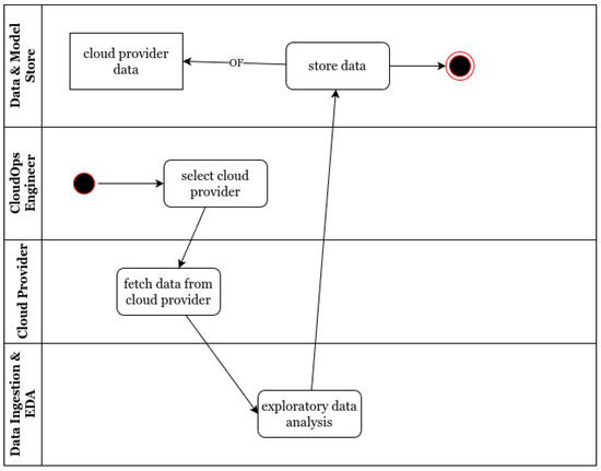 The Data Ingestion and EDA subsystem enables the integration of data from multiple cloud providers—such as AWS, Google Cloud, IBM Cloud, and others. Data can be imported either through API connections or manual uploads. Figure 4 illustrates an activity diagram that analyzes the “data ingest” use case depicted in Figure 3. In this process, the CloudOps engineer begins by selecting the target cloud provider from which data will be ingested. Next, the engineer initiates the “fetch data” action, followed by the exploratory analysis and data analysis actions. This sequence continues until the data are successfully stored in the Data and Model Store subsystem.