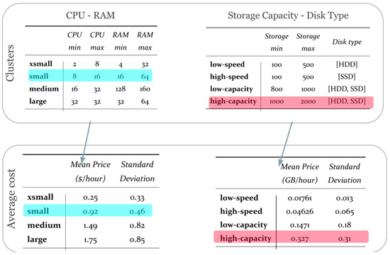 The table shows the average price and standard deviation for CPU-RAM and storage capacity clusters. For instance, the ‘xsmall’ category, with minimal CPU and RAM resources, has an average cost of USD 0.25/h, while larger configurations like ‘large’ services cost around USD 1.75/h.