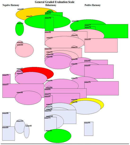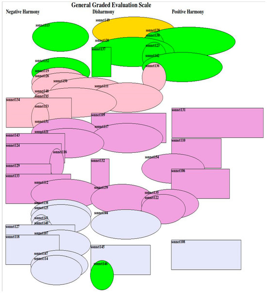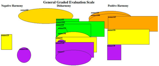 As said above, sonnets are aligned into three columns where sonnets with square and rectangular shapes have parameters in full agreement, while sonnets in ellipses contain disagreements and also partially matching sentiment-related parameters. In particular, in order to be situated in one of the three lists, at first, the semantic- and sentiment-based sense evaluation is considered, then the sounds, which in the case of a poor match, contribute to placing the figure closer to the column on the right-hand side, except for the positively marked ones, which, being the last column, will be placed on its left-hand side.