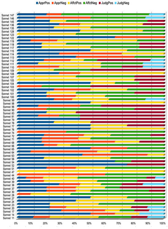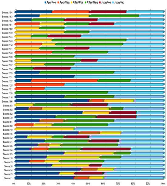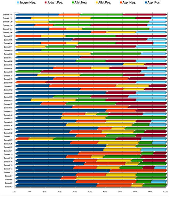 However, detecting irony vs. sarcasm and neutral mood requires a much deeper and accurate analysis of the semantics and the pragmatics of the sonnets. In a number of recent papers [13,14], an evaluation of the sonnets was proposed based on the so-called Appraisal Theory Framework (ATF), which makes available an objective tool for comparison. To this aim, each sonnet was manually annotated by the second author, using the highly sophisticated labelling system proposed by the ATF (see [15,16]). (The theory is organized around three subsystems, Engagement, Graduation, and Attitude. We chose to select Attitude for our annotation guideline. The Attitude subsystem describes the author’s feelings and intentions as they are conveyed within the text, and it is articulated into three main semantic regions or subclasses with their relative positive/negative polarity, namely, Affect, Judgement, and Appreciation. More is in this section below.)
