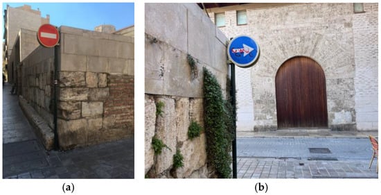 Corner of Harina Street and Almudín Street. A construction method different from that of a house can be observed, both in the corner and in the wall, which is made up of ashlars: (a) View from Calle de la Harina, at left view of the old flour-weighing house corner with the Almudín gate in the background; (b) Old flour-weighing house’s corner still existing.