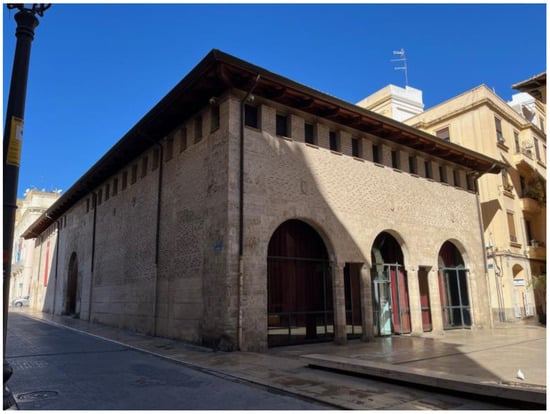 As for the “new flour-weighing house”, according to Esclapez, in 1517, it began to be built on a site facing Salvador Street [] (p. 41). This house was tiny and in 1594, the city bought other houses in the block to build a larger flour-weighing house (Figure 2) piece of the block, which the city council bought opposite the Almudín, facing Salvador Street [] (p. 41). Its great capacity is proven when the city was left without a theatre; initiated by the enlightened archbishop Andrés Mayoral, the flour-weighing house replaced its functions, until the abandoned Balda theatre was rehabilitated, from 23 November 1761 to 17 January 1762 [] (p. 37).