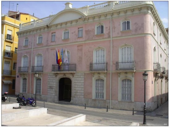 After a long process (1835–1846), the court’s ruling prescribed the payment of 3 million reales, the amount of nine pensions owed (from 1814 to 1823) [] (p. 54). If this amount was not paid, the debtors of the censused were ordered to seize and auction off the city’s “own” property, which was what had to be done. Among the properties that were finally sold was the “house of the weight of flour”, which is reported by the Marquis of Cruilles in his Guía Urbana de Valencia Antigua y Moderna [] (p. 60). It was put up for auction with a rental value of 0.00 reales; a rate of 400 reales and a price of 66,220 reales were reached, and it was bought by Lamberto Teruel, on behalf of Santiago García. This was because Santiago García “(…) was a councillor of the Valencia city council –and provincial deputy- in the years when he admonished the council, announcing the auctions” [] (p. 56). The “new flour weighing house” had operated, going through various extensions, from 1517 to 1863, until it passed into private hands. Since then, in Valencia, the building located at 1 Almudín Street has been known as the Palace of the Marquise of Colomina (Figure 7).