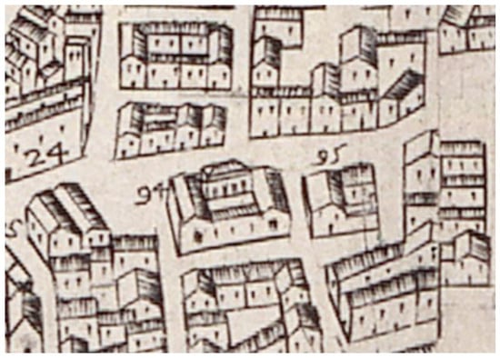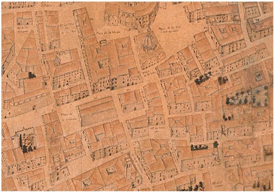 The continuous location of the flour-weighing house at 1 Almudín Street can be identified in all historical Valencian maps, from 1608 (Figure 8), with number 95, to the present day [].