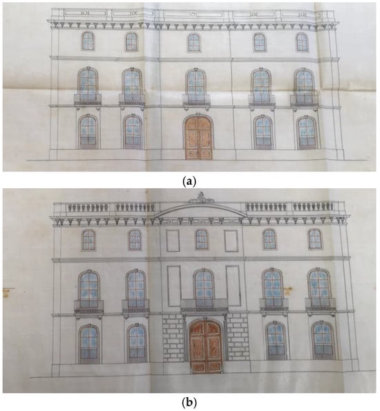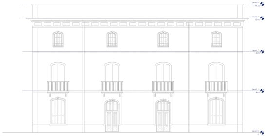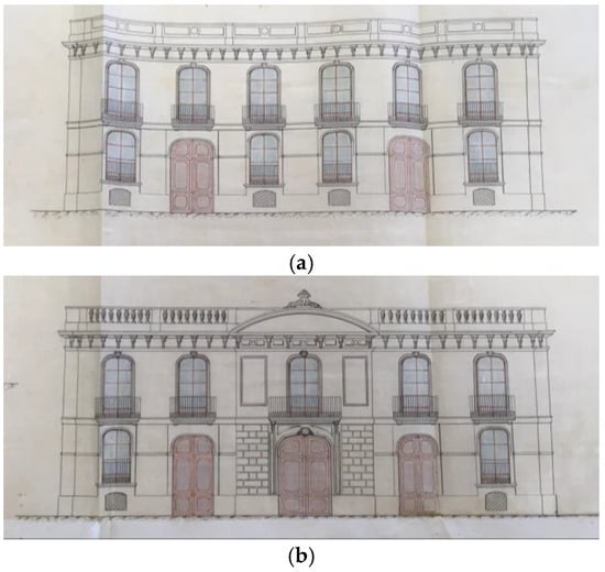 In the Municipal Historical Archive of Valencia, there is a file from the Urban Police referring to the flour-weighing house []. It was urged by Santiago García, and in it, he requested a license for reforming his property, based on a project by the master builder Manuel Ferrando. The file contains two proposals. The first is a request for a license dated 4 June 1863, where Ferrando presented the four façades, with a height of two floors that would be extended with a basement, which would not increase the maximum historical height of the flour-weighing house (Figure 13).