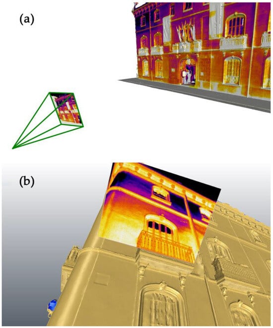 However, as previously underlined, thermal imagery has traditionally been used for visual inspections and through two-dimensional visualisations. To make the radiometric information derived from TIR (Thermal Infrared) images metrically measurable and referable to 3D models generated by the aforementioned 3D sensing techniques—specifically, TLS and digital photogrammetry—numerous research groups have developed and are developing new methods for integrating thermal images and high-resolution 3D models, primarily using photogrammetric approaches, achieving remarkable results [,,].